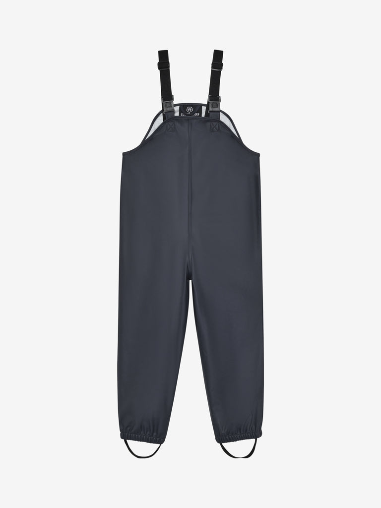In all sizes, the rain pants are bibbed overalls with adjustable elastic suspenders.