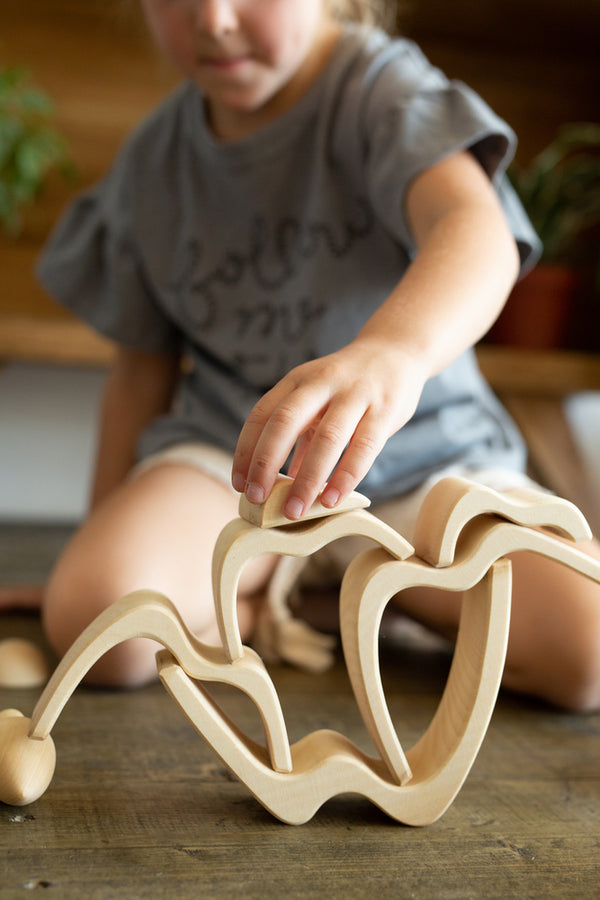 Wooden Stackers (and our new Silicone first stacker) are a popular playroom decor and creative play toy. Rainbow stackers or various shape stackers create open ended play opportunities for children to build, design, sort, stack, knock down, and imagine. Stackers can be used in endless ways and should always be given without instructions so that children can discover their own way of play, which will change over time and as they add other elements and toys into their play.